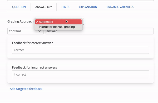 A drop-down menu allows for the question to be automatically graded or manually graded by the instructor. Automatically graded activities are recorded into the gradebook based on answers corrected as interpreted by the parameters set in Torus. Activities manually graded by the instructor will not receive an automatic push into the gradebook.
