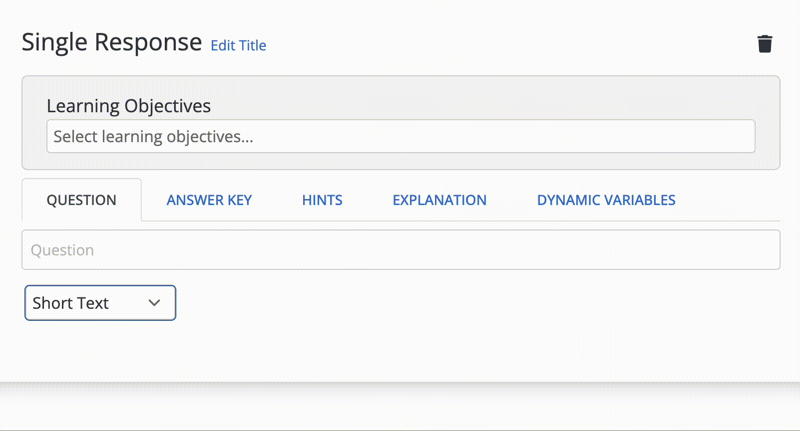 Single Response questions are used to collect student input and compare the input answer to a customizable field. Short Text and Paragraph use the same interface, but Short Text allows for a smaller response, while Paragraph asks for longer and more complex responses.